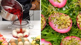 Na wielkanocnym stole nie może zabraknąć oczywiście faszerowanych jajek. W tym roku zaskocz swoich bliskich barwionymi przekąskami w pięknym bordowym kolorze. Jak uzyskać taki efekt? Obejrzyj nasze wideo z dokładną instrukcją. Listę składników znajdziesz poniżej.